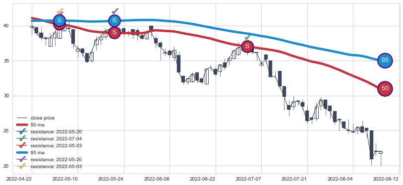 下跌趋势2022-04-22-2022-08-12,均线50, 95确认关键阻力3处