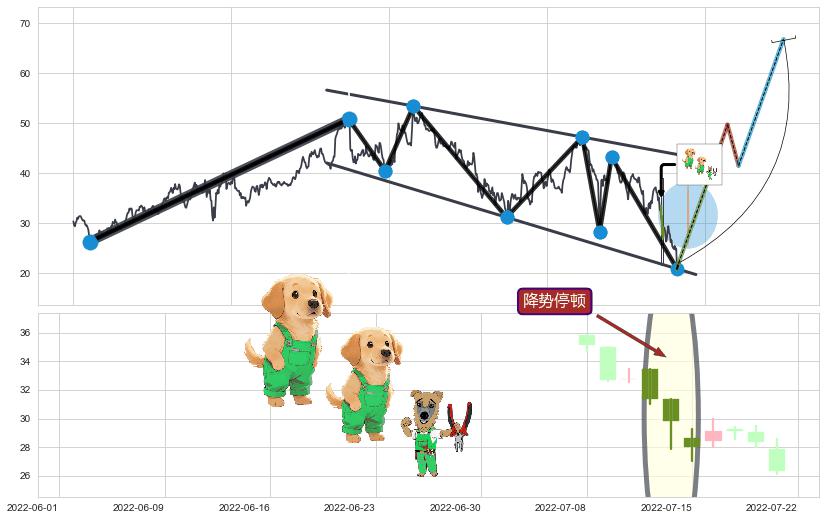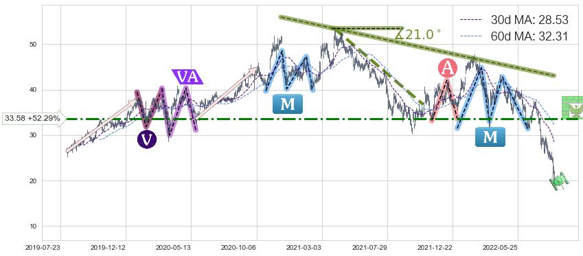 ➢ 【多方力量耗尽,空方打破攻守平衡点】下降三角形中继整理, 已在2022-07-21突破【支撑】颈线 28.30 →演变成下降通道