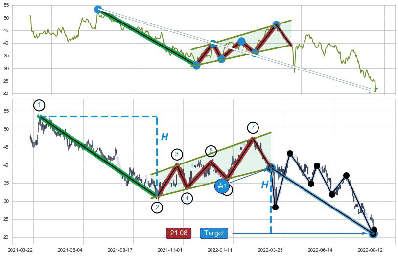 ➣ 最小中继整理跌幅→𝐇: 22.25 (𝐇旗杆的长度:旗杆起点→顶点)