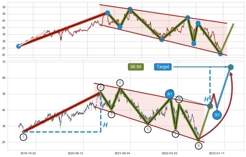 ➣ AI预测: 假定反转启动后, 第❶目标位置(2023-11-01, 28.72)