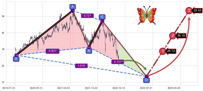 ➣ 未完成【蝴蝶】形态起点X: 2019-08-05, 已到达C点: 2022-02-11, 预测最终D点: 2023-05-19, 共945交易日