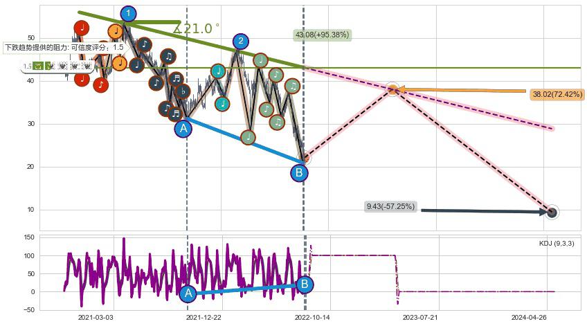 ➣ D点拟合预测价格13.43,距离最后交易收盘价格22.05相差 -39.08%