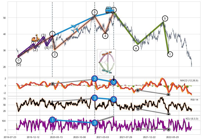 ➢ a,c调整浪MACD, RSI, KDJ走势都【未出现】背离,abc走势延续, 5浪反转概率增强