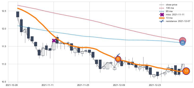 下跌趋势2021-10-28-2022-01-03,均线13确认关键阻力1处