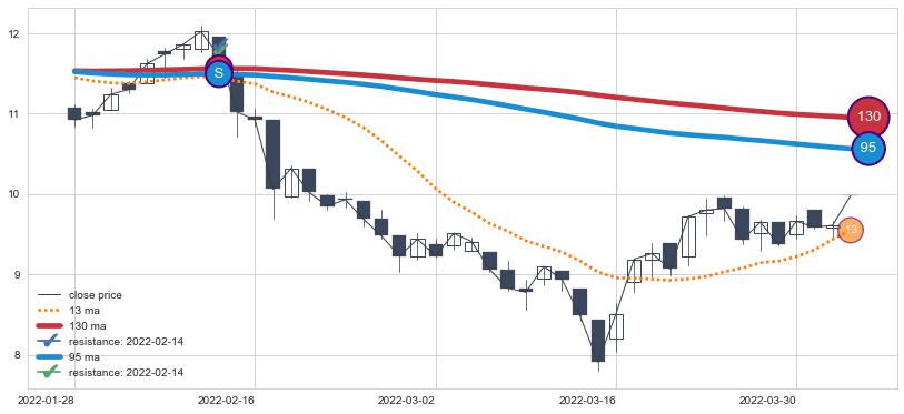 下跌趋势2022-01-28-2022-04-04,均线130, 95确认关键阻力1处
