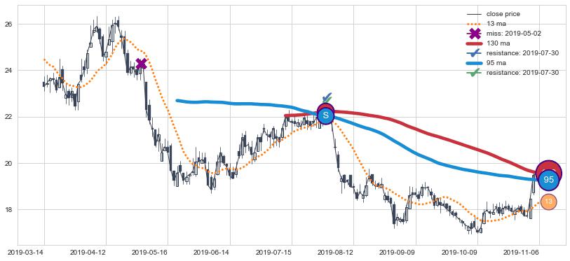 下跌趋势2019-03-14-2019-11-06,均线130, 95确认关键阻力1处