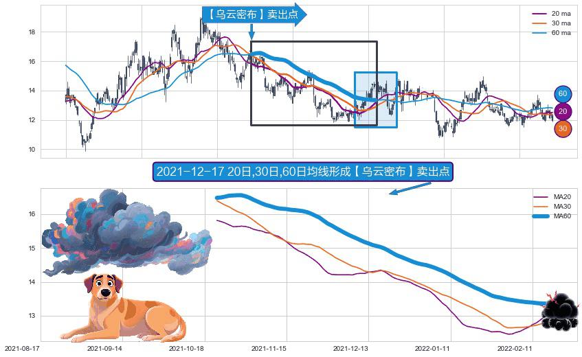 ⚀ 2021-10-21日-2022-02-18日显现 20日-30日-60日均线 【乌云密布】卖出点 看空信号,后市看跌,卖出
