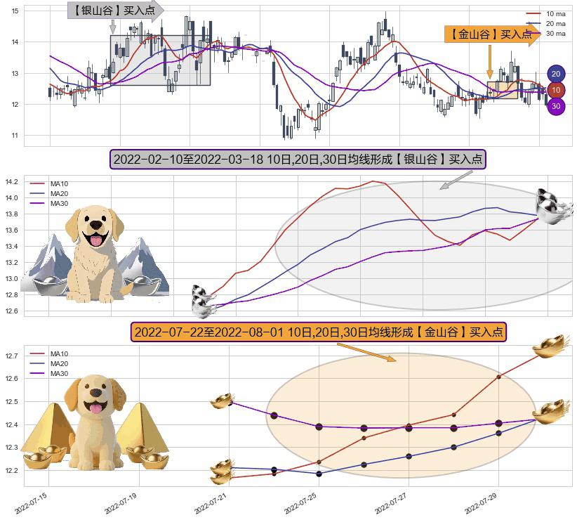 ⚀ 2022-07-25-日至2022-08-01-日显现 10日-20日-30日均线 【金山谷】买入点 其再次确认了买入信号,可靠性更强,买入