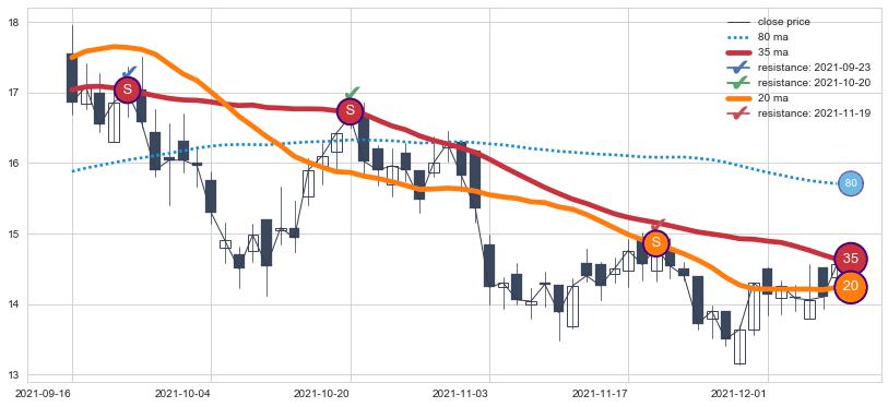⚁ MA20和MA30走势平行,且始终保持在短距离内,MA60始终在短中期均线上方,与短中期均线保持一定的距离,微微下行
