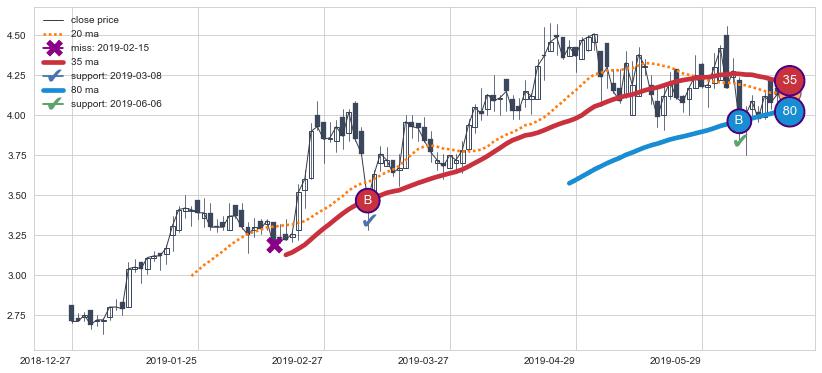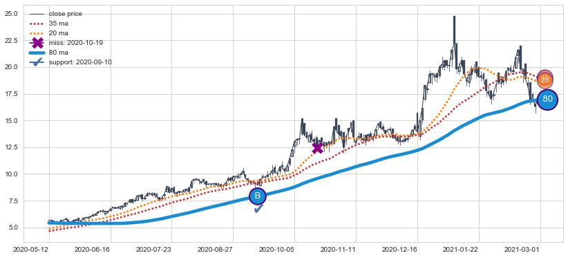 ⚁ MA5和MA10走势平行,且始终保持在短距离内,MA20始终在短中期均线下方,与短中期均线保持一定的距离,微微上行