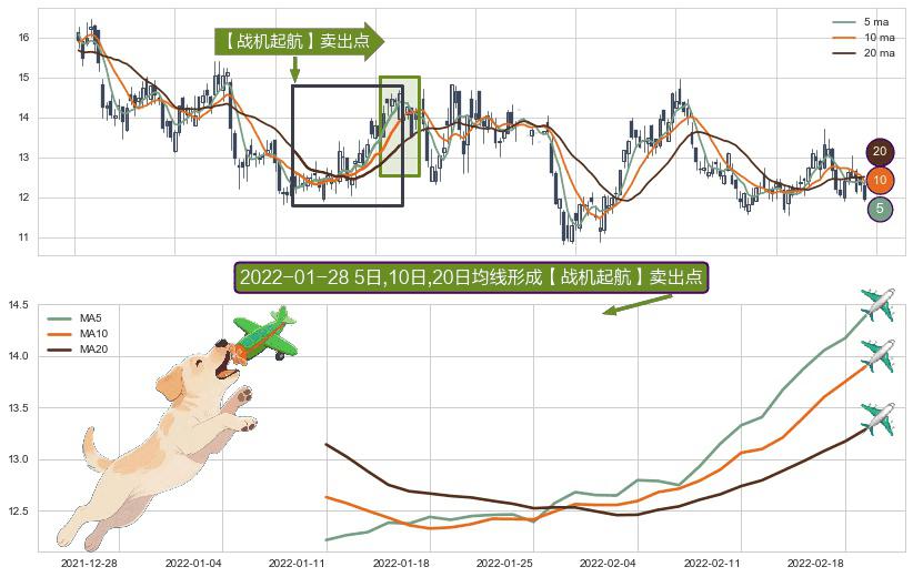 ⚀ 2022-01-11日-2022-02-21日显现 5日-10日-20日均线 【战机起航】卖出点 看空信号,后市看跌,卖出