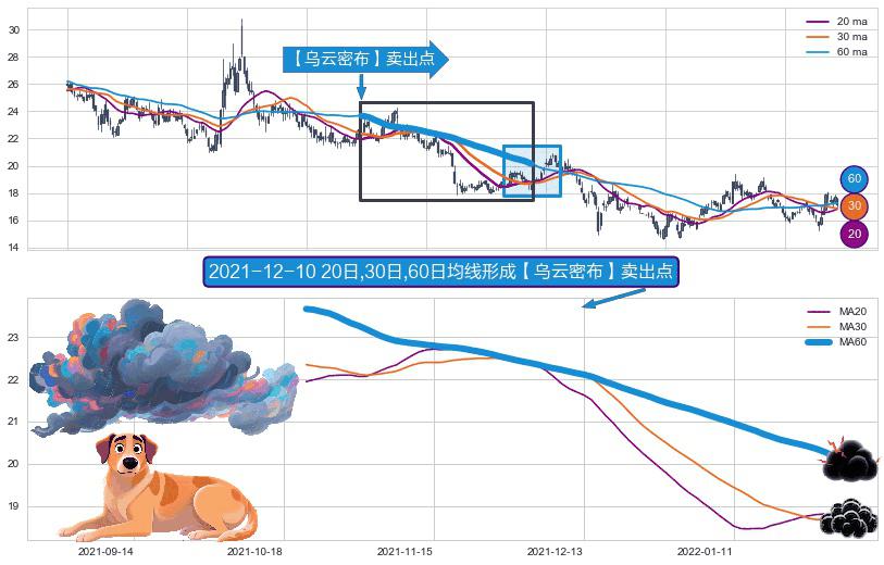 ⚀ 2021-10-21日-2022-01-31日显现 20日-30日-60日均线 【乌云密布】卖出点 看空信号,后市看跌,卖出