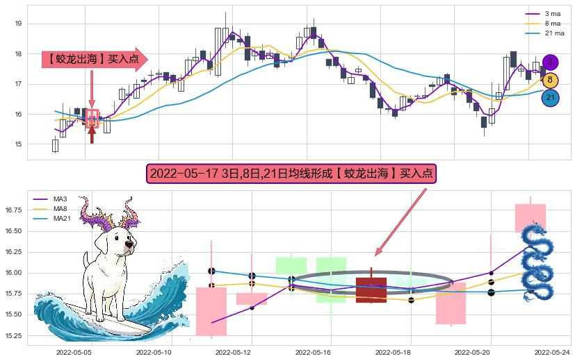 ⚀ 2022-05-17日显现 3日-8日-21日均线 【蛟龙出海】买入点 看多信号,后市看涨,买入