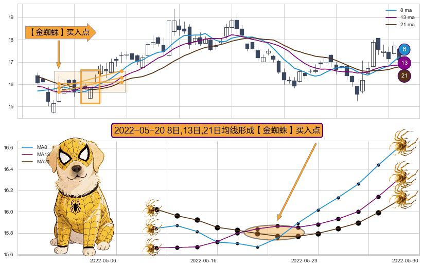 ⚀ 2022-05-20日显现 8日-13日-21日均线 【金蜘蛛】买入点 看多信号,后市看涨,买入
