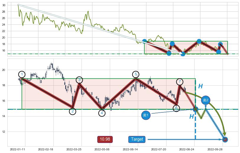 ➣ 【未确认突破,预测即将形成突破】下跌矩形整理起点:2021-10-22, 预测突破点:2022-08-25,形态共208交易日