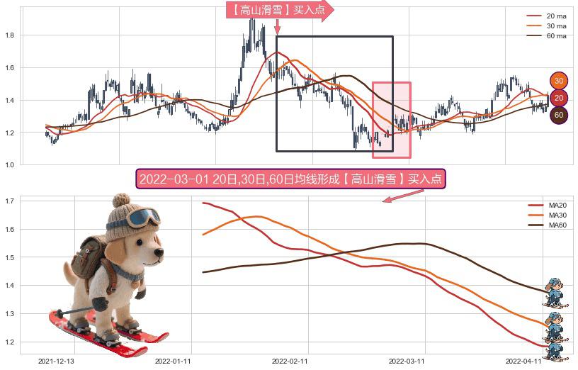 ⚀ 2022-01-13日-2022-04-12日显现 20日-30日-60日均线 【高山滑雪】买入点 看多信号,后市看涨,买入