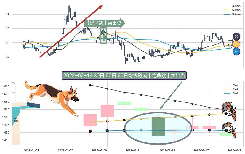 ⚀ 2022-02-14日显现 30日-60日-90日均线 【绝命跳】卖出点 看空信号,后市看跌,卖出