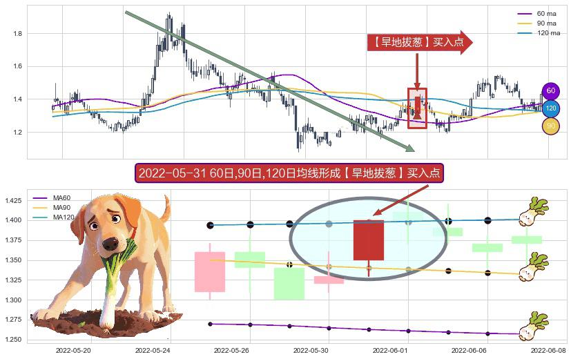 ⚀ 2022-05-31日显现 60日-90日-120日均线 【旱地拔葱】买入点 看多信号,后市看涨,买入