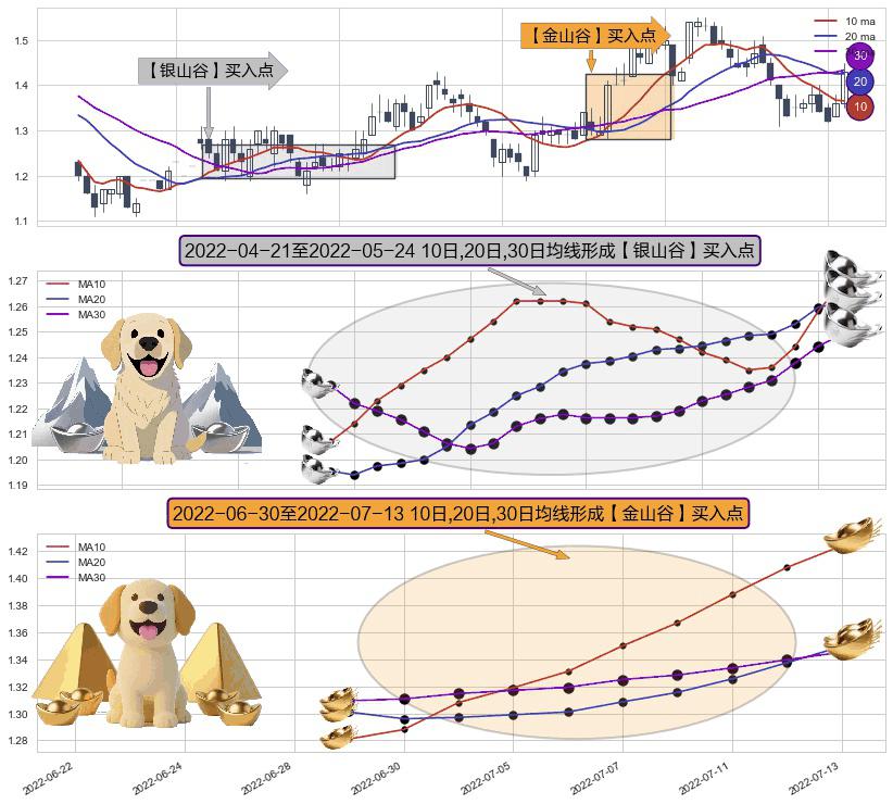 ⚃ 2022-07-04-日至2022-07-13-日显现 10日-20日-30日均线 【金山谷】买入点 其再次确认了买入信号,可靠性更强,买入