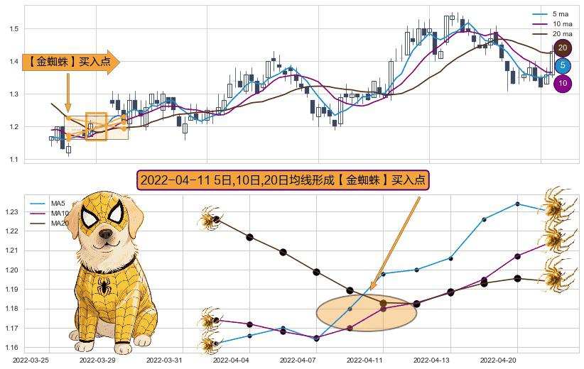⚀ 2022-04-11日显现 5日-10日-20日均线 【金蜘蛛】买入点 看多信号,后市看涨,买入