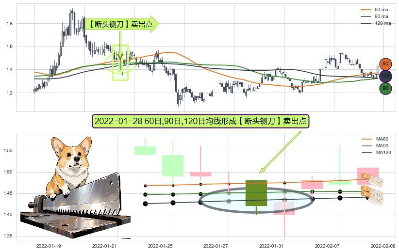 ⚀ 2022-01-28日显现 60日-90日-120日均线 【断头铡刀】卖出点 看空信号,后市看跌,卖出