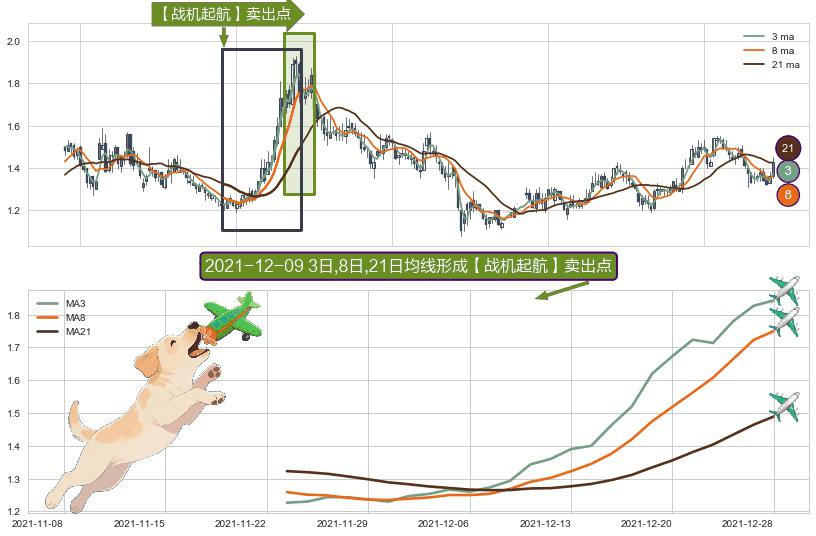 ⚀ 2021-11-23日-2021-12-28日显现 3日-8日-21日均线 【战机起航】卖出点 看空信号,后市看跌,卖出