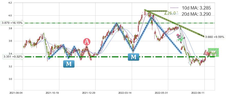 ♘ 阻力价格位3.351,可信任强度78.39%,距离最后交易2022-08-12形成的收盘价格3.340相差 +0.32%
