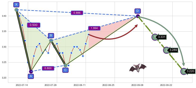 ➣ 未完成【蝙蝠】形态起点X: 2022-07-08, 已到达C点: 2022-08-02, 预测最终D点: 2022-09-06, 共43交易日