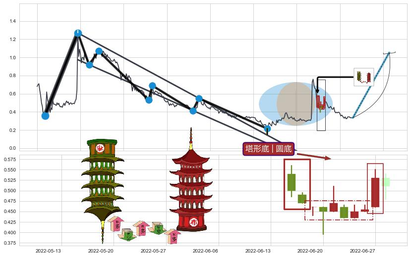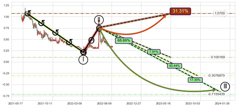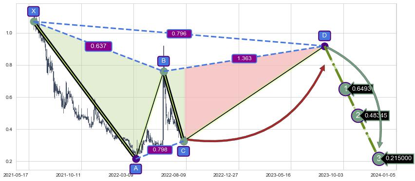 ➣ D点拟合预测价格0.9178,距离最后交易收盘价格0.33500相差 +173.96%