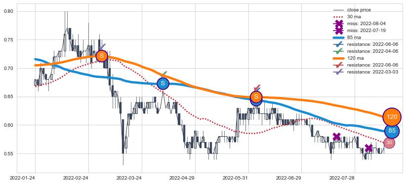下跌趋势2022-01-24-2022-08-12,均线120, 85确认关键阻力3处