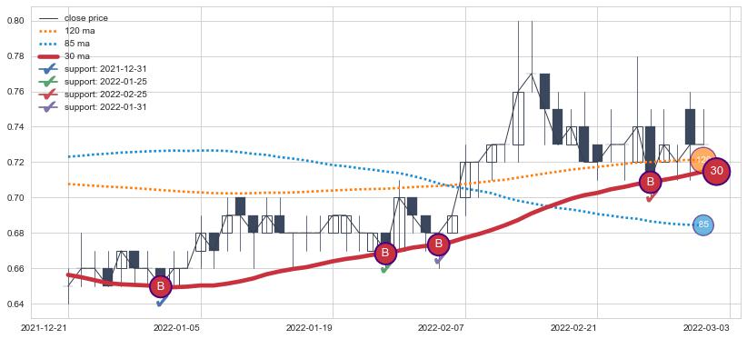 上涨趋势2021-12-21-2022-03-03,均线30确认关键支撑4处