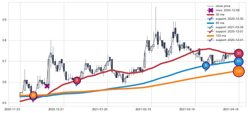 上涨趋势2020-11-23-2021-04-19,均线120, 85, 30确认关键支撑3处