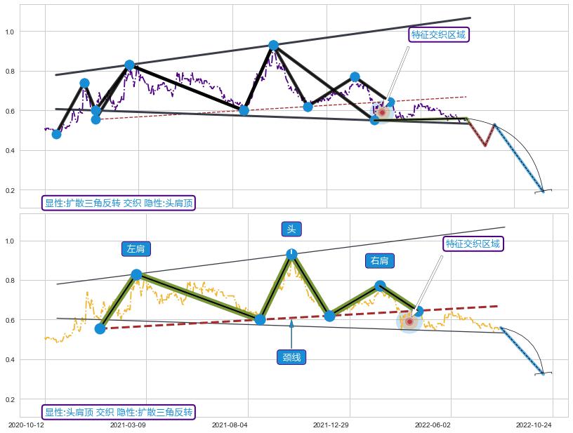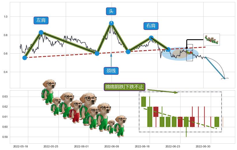 | 7 🅚:上探下跌 ➕ 📐:头肩顶下行突破支撑位破位, 猜想持续下沉下跌,被突破的支撑位已变为阻力位 ☞ 看空信号 ⇥ 【🅚线】交织【图形】⇥ 综合量化分数: 49 | > |