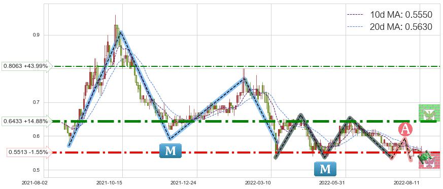 ♘ 阻力价格位0.6433,可信任强度89.02%,距离最后交易2022-08-12形成的收盘价格0.5600相差 +14.88%