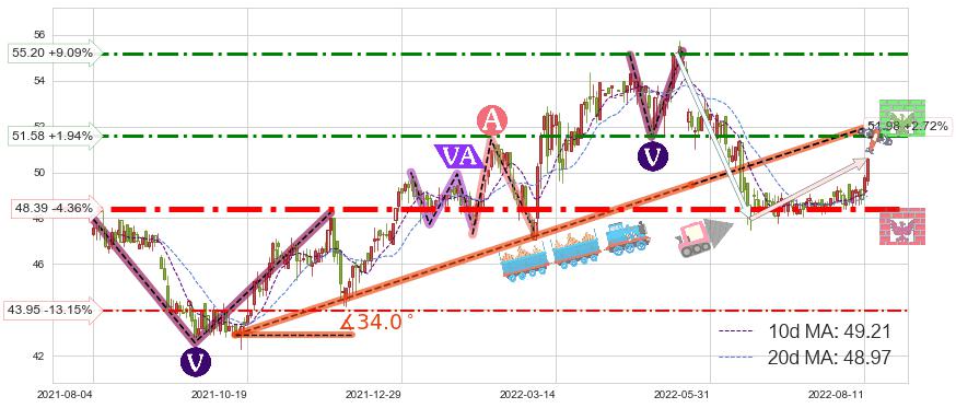 ♘ 阻力价格位55.20,可信任强度64.04%,距离最后交易2022-08-12形成的收盘价格50.60相差 +9.09%