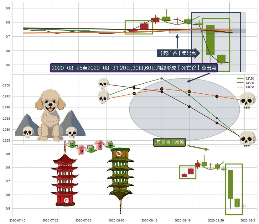 | 2 🅚:下跌两颗星 | 下跌三颗星 ➕ 🎢:【死亡谷】卖出点均线组合卖出点信号形成后,猜想后续破位下跌,沿着向下的尖头三角下跌 ☞ 看空信号 ⇥ 【均线】交织【🅚线】⇥ 综合量化分数: 49 | > |