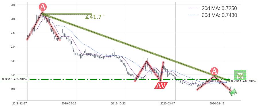 ♘ 在最后的下跌阶段2019-02-14至2020-08-31,存在 持续未破位的阻力位 ,阻力价格0.7611,可信任强度86.16%,其距离最后价格0.5200相差 +46.36%