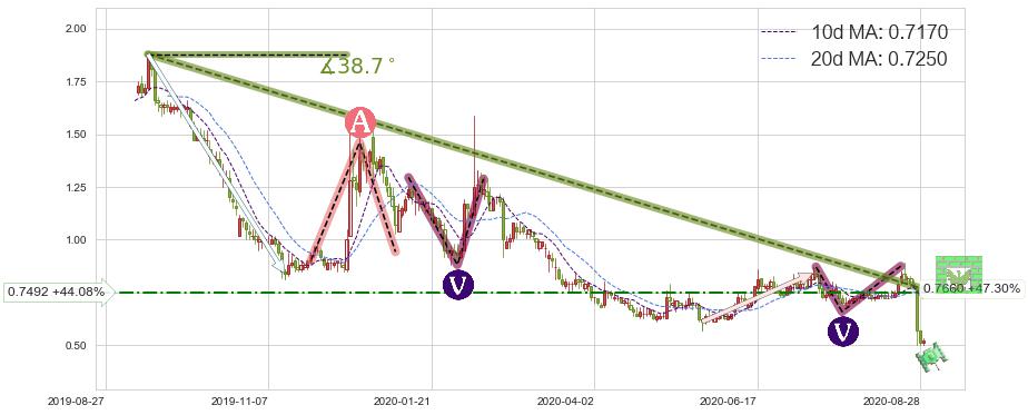 从2019-09-13至2020-08-31,共包含239个交易日,阶段股价下跌-100.62%,阶段股价变动位移路程比: 1 : 7,下跌趋势角度: 38.7