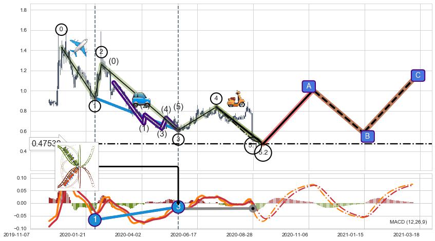 ➣ 5.1: 预测当前第5浪位置(2020-08-28, 0.5100),仍然有下跌空间