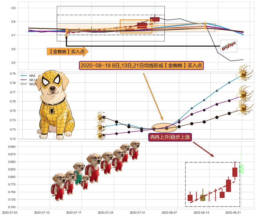| 2 🅚:塔形底 | 圆底 ➕ 🎢:【金蜘蛛】买入点均线组合买入点信号形成后,猜想三条均线周期内的交易者都看好后市,持续上涨 ☞ 看多信号 ⇥ 【均线】交织【🅚线】⇥ 综合量化分数: 51 | > |