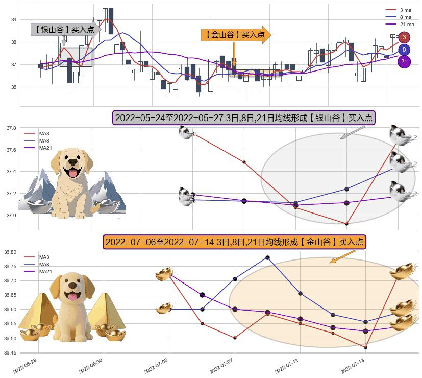 ⚂ 2022-07-07-日至2022-07-14-日显现 3日-8日-21日均线 【金山谷】买入点 其再次确认了买入信号,可靠性更强,买入
