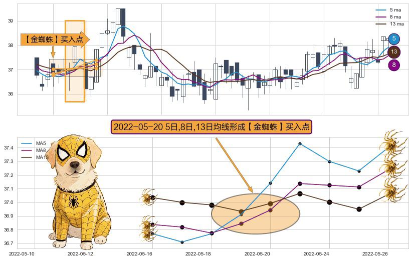 ⚀ 2022-05-20日显现 5日-8日-13日均线 【金蜘蛛】买入点 看多信号,后市看涨,买入