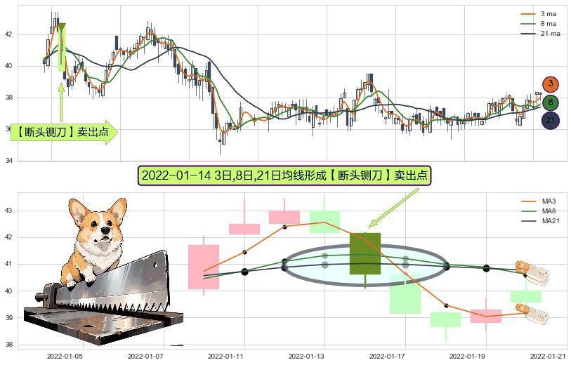 ⚀ 2022-01-14日显现 3日-8日-21日均线 【断头铡刀】卖出点 看空信号,后市看跌,卖出