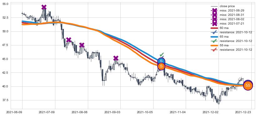 ⚄ 价格在均线遇到阻力后再次向下回落了【极短】距离, 第⑦卖出点 阻力效果【等待验证】