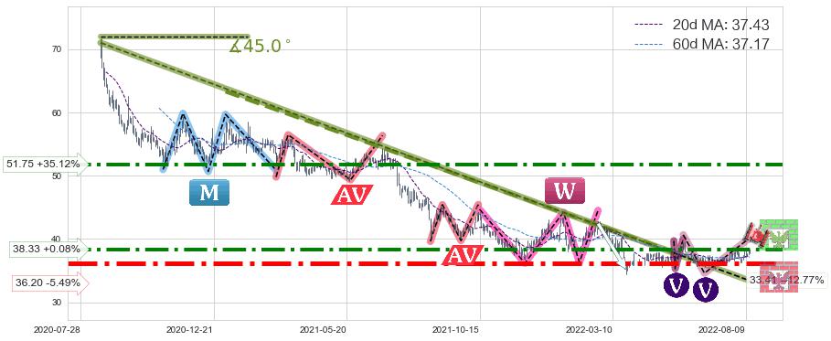 ♘ 支撑价格位36.20,可信任强度94.23%,距离最后交易2022-08-12形成的收盘价格38.30相差 -5.49%