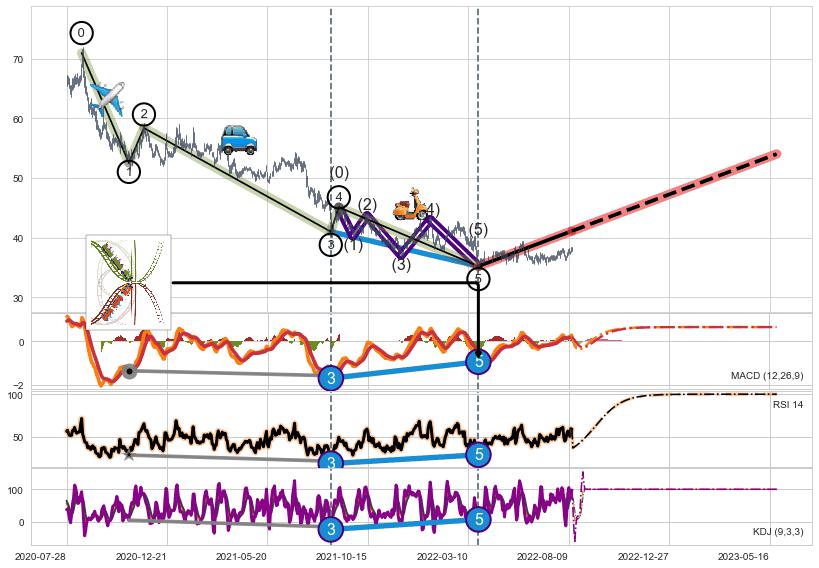 ➣ 1,3,5驱动浪MACD, RSI, KDJ走势都出现【常规背离】反转信号增强