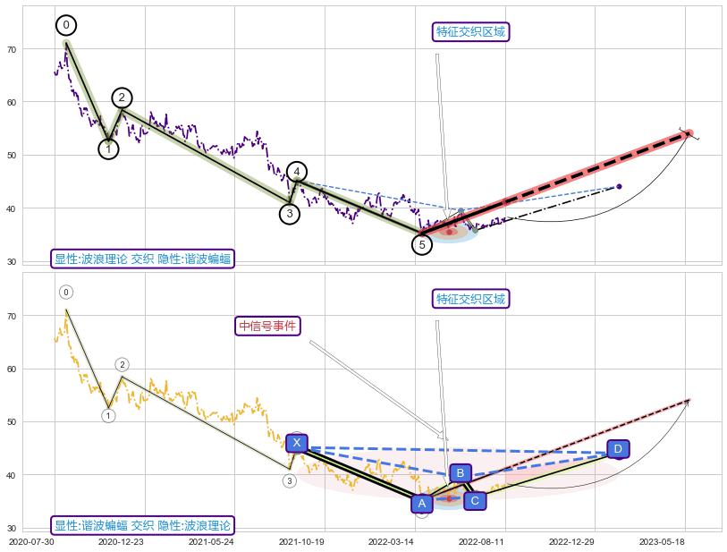 | 4 🅚:底部尽头线(上山虎) ➕ 🌊:波浪理论猜想下跌浪5已形成,猜想后续形成abc反弹上涨(均值回复) ☞ 看多信号 ⇥ 【🅚线】交织【图形】⇥ 综合量化分数: 57 | > |