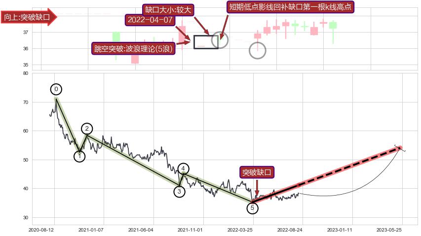➢ 突破缺口形成后,后续k已经超过14根,跳空突破波浪理论(5浪)关键点后, 出现【深度回踩】迹象,短期低点影线回补缺口第一根k线高点