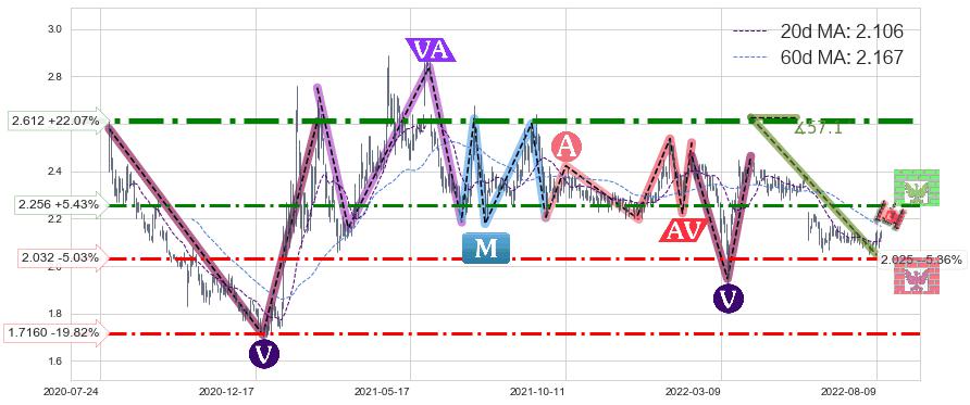 ♘ 阻力价格位2.256,可信任强度67.50%,距离最后交易2022-08-12形成的收盘价格2.140相差 +5.43%