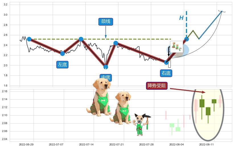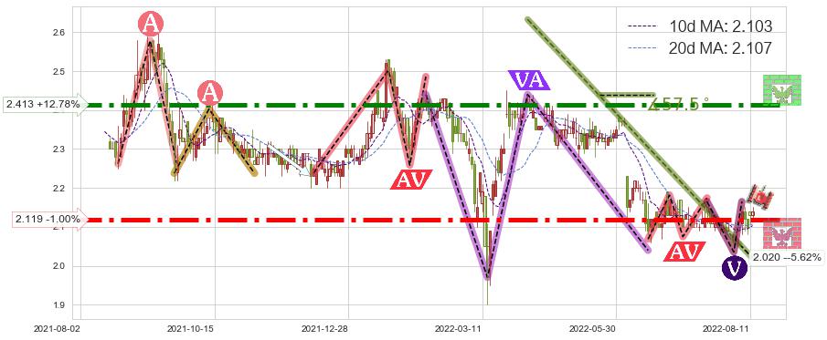 ♘ 支撑价格位2.119,可信任强度88.67%,距离最后交易2022-08-12形成的收盘价格2.140相差 -1.00%